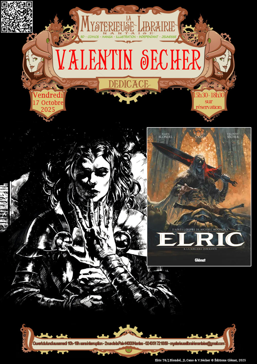 A l’occasion de la sortie du T6 d’Elric (avec J.Blondel & JLCano) aux éditions Glénat, Valentin Sécher revient à la librairie ! Pour les vrais fans, V.Sécher proposent des dédicaces payantes très poussées le Vendredi 17 Octobre de 10h à 12h pour 50€. Vous pouvez découvrir des exemples de telles dédicaces ici, là ou ici. Attention, les places seront extrêmement limitées.