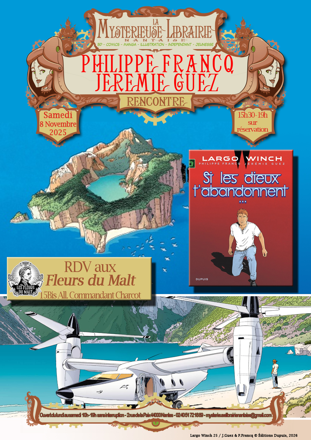 Avec ce tome 25, c’est un nouveau scénariste qui prend en main le destin du héros milliardaire : Jérémie Guez ! Ce dernier et Philippe Francq vous donne RDV Samedi 08 Novembre de 15h30 à 19h aux Fleurs du Malt. De 15h30 à 16h30, les auteurs vous dévoileront les secrets de leur nouvelle collaboration et les coulisses de leur création. Puis de 16h30 à 18h, une séance de signatures vous sera proposée sur leur dernier album et enfin à partir de 18h, les Fleurs du Malt vous proposeront de déguster une sélection de bières locales en compagnie des auteurs ! La présence à la table ronde de 15h30 est indispensable pour obtenir une signature.