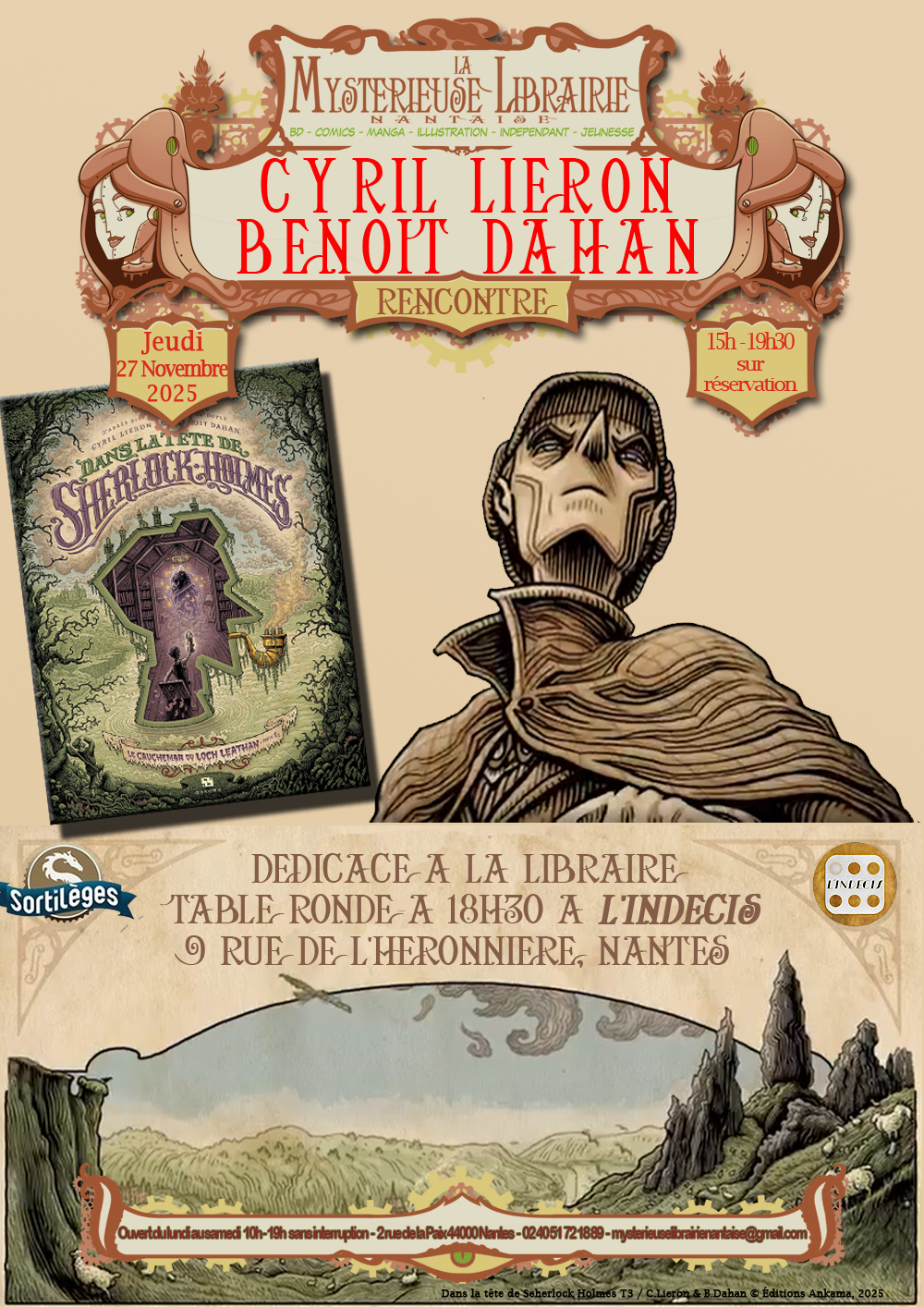 Sherlock Holmes est de retour dans le Cauchemar de Loch Leathan ! Une nouvelle enquête le mène au cœur de l’Écosse. Suivez le fil de sa pensée pour découvrir tous les mystères de cette nouvelle affaire ! Découvrez aussi cet album des éditions Ankama en avant-première Jeudi 27 Novembre en compagnie de Cyril Lieron & Benoit Dahan. De 15h à 18h à la Mystérieuse Librairie Nantaise, les auteurs dédicaceront le premier tome de leur nouveau dyptique mais aussi « Unlock » réalisé dans le même univers. A 18h30, suivez-les jusqu’au bar-jeu L’Indécis (9 rue de l’Héronnière, Nantes) pour discuter ensemble de leur processus créatif, des idées ludiques et scénaristiques à mettre en place et bien d’autres choses. Pour profiter pleinement du moment, une consommation sera demandée sur place.