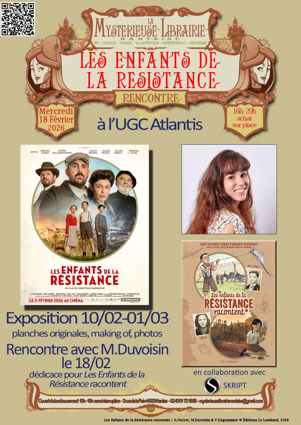 A partir du 10 février jusqu’au 01 mars, venez admirer les planches de Marie Duvoisin sur la série dérivée Les Enfants de la Résistance Racontent à l’UGC Ciné Cité d’Atlantis. Vous y trouverez également des panneaux pédagogiques de cette incroyable série mais également des photos du tournage et le making-off du film.