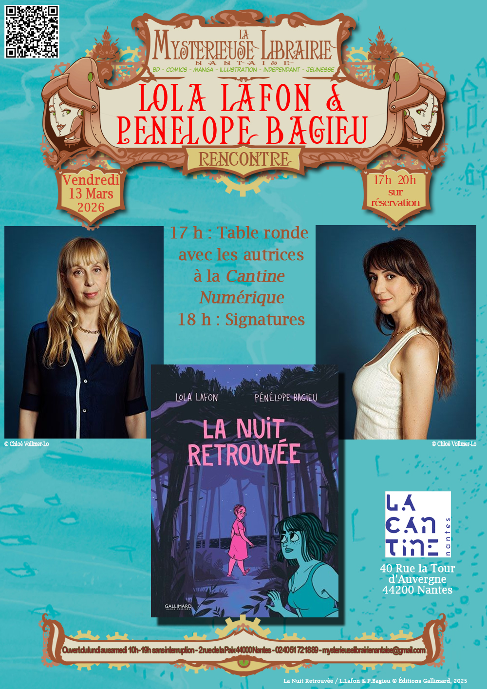 - passez à la Mystérieuse Librairie Nantaise avant le jeudi 12 mars pour valider votre réservation avec un achat : cela peut-être La Nuit retrouvée, une autre titre des autrices ou n’importe quel album disponible en magasin.